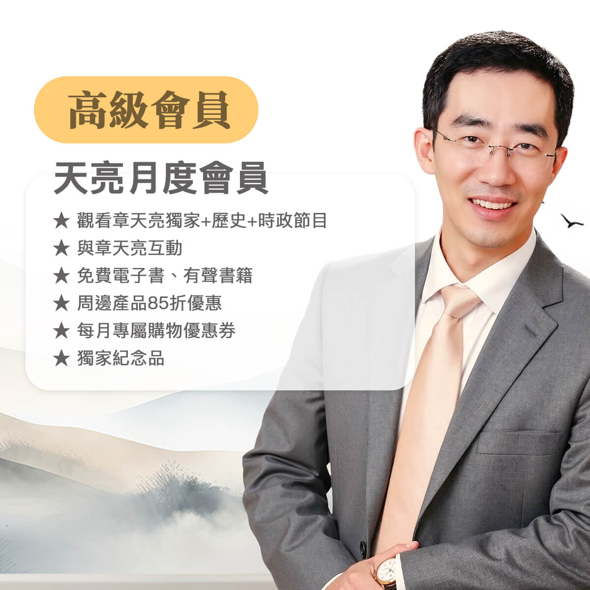 ★觀看章天亮獨家+歷史+時政節目 ★與章天亮互動 ★免費電子書、有聲書籍 ★周邊產品85折優惠 ★每月專屬購物優惠券 ★獨家紀念品