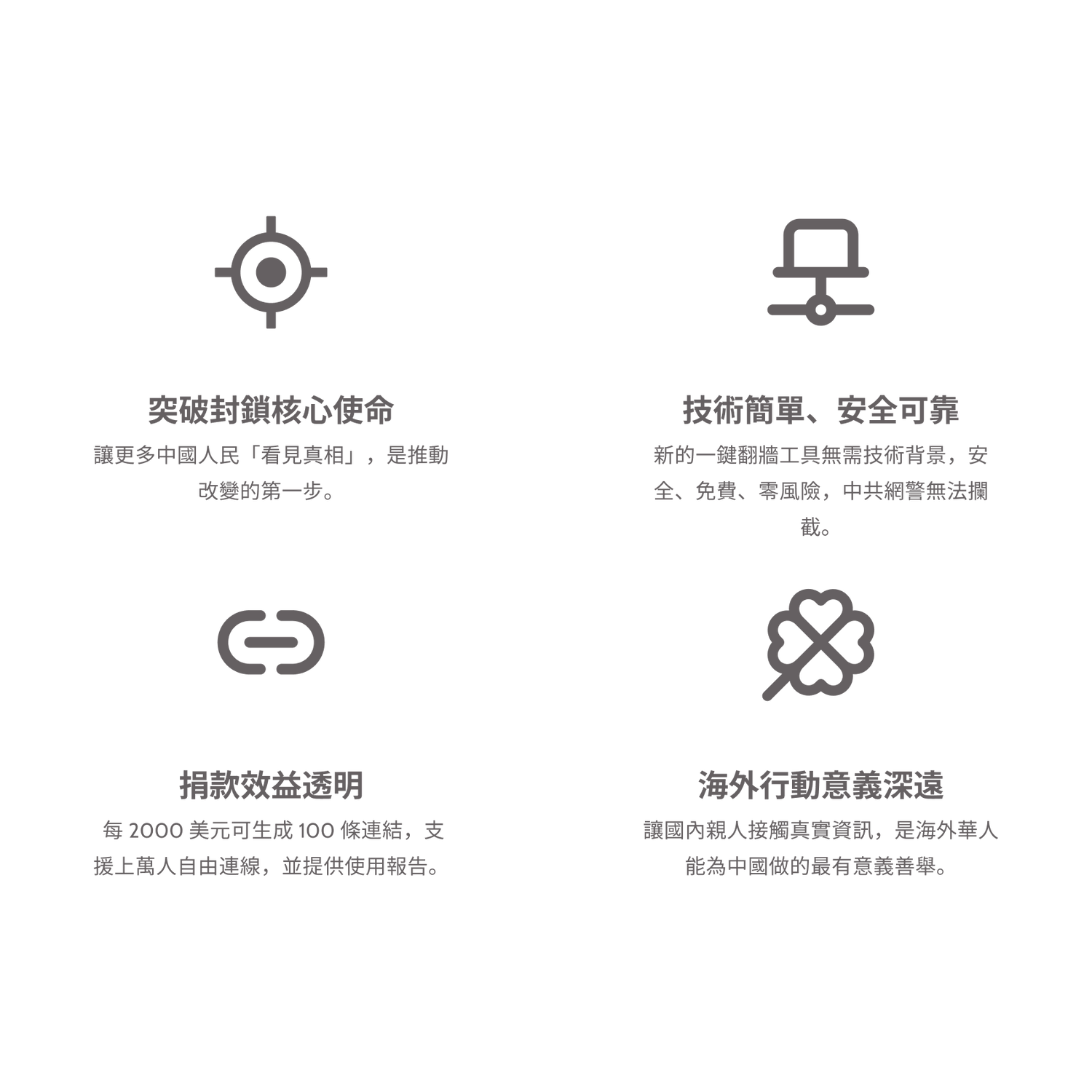 這項行動由海外華人科技團隊研發,讓沒有技術背景的使用者也能安全、免費地連上自由世界。每籌集 2000 美元,就能生成 100 條安全翻牆連結,讓上萬名國內朋友 30 天內隨時接觸真實資訊。
