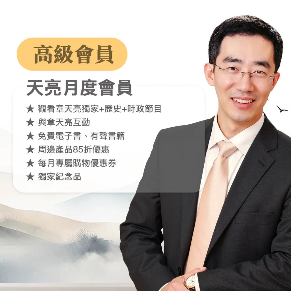★觀看章天亮獨家+歷史+時政節目 ★與章天亮互動 ★免費電子書、有聲書籍 ★周邊產品85折優惠 ★每月專屬購物優惠券 ★獨家紀念品